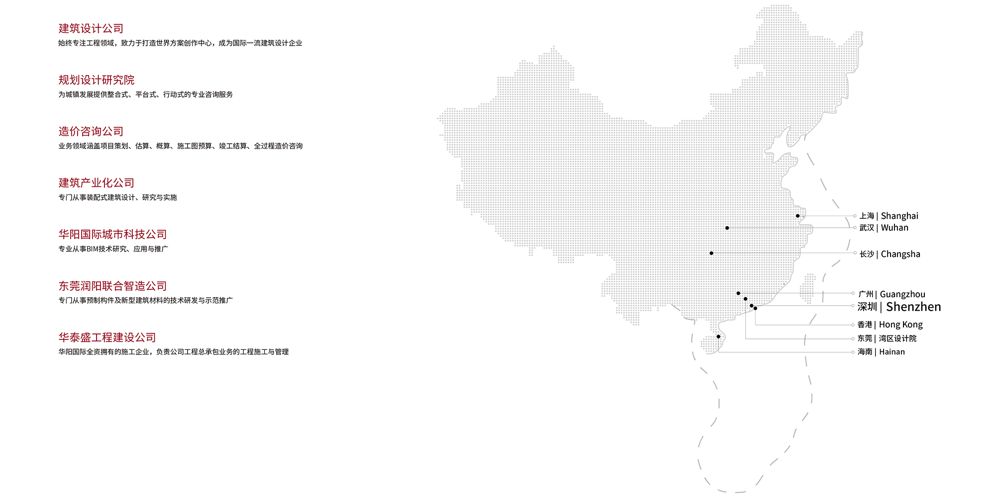 深圳市华阳国际工程设计股份有限公司(公司简称:华阳国际,股票代码:002949)总部位于深圳,2019年在深圳证券交易所上市,是中国十大民营工程设计企业TOP5、深圳500强企业。区域公司遍布深圳、香港(CAN)、广州、上海、长沙、武汉等核心城市,业务范围全面覆盖规划、设计、造价咨询、装配式建筑、BIM技术研究、生产制造、施工建设、全过程工程咨询、代建及工程总承包等建筑领域。代表设计作品有:新皇岗口岸、莲塘口岸、深圳科学技术馆、华为松山湖、华为青浦练秋湖研发中心、深圳清华大学研究院新大楼、大疆天空之城、深圳华润城及万象天地、深业上城南区、深超总SIC深湾睿云中心(天空之境)等。