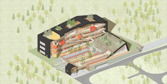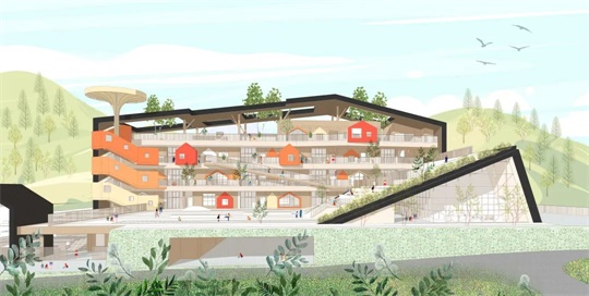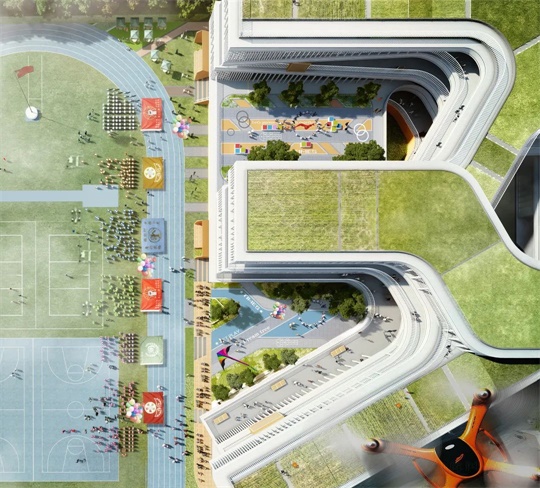 知识城·悦辰壹号小学幼儿园,规划轴线联通凤凰湖与帽峰山,融入周边自然环境;园区内建设露台、屋顶绿化平台、屋顶有机农田,多重绿色景观,形成一片“知识森林”。