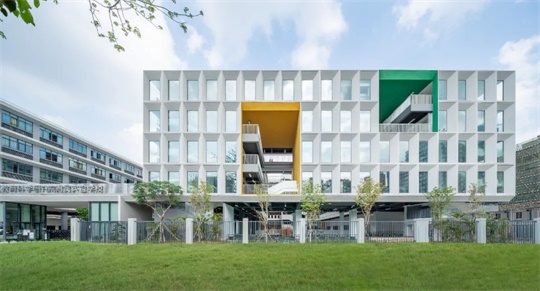 深圳市龙华区教科院附属实验学校,建筑在面向城市的界面,在简洁的秩序之上,布置彩色洞口,形成连接城市的窗口,也创造了多彩的活动空间。