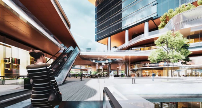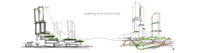商业设计充分利用架空云廊的条件,把街区式商业顺着云廊系统的走势布置,连接周边地块,打通地铁与开放绿地到云谷核心的对角商业动线,形成整体的商业氛围。同时,流线型的设计也提供更多展示面,扩大访问者的观览视野,提升购物体验及商业价值。退台、架空、下沉广场的设计,也在地块不同位置形成各不相同的节点空间,创造三维立体的开放共享商业模式,带动整个片区的活力。