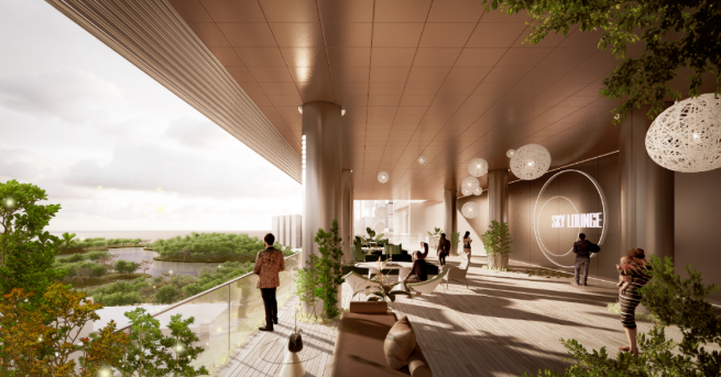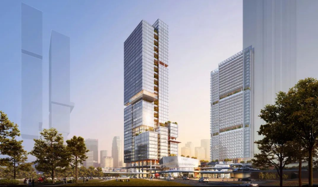 设计充分考虑地形高差,积极利用岗头水库自然资源,合理布局,打造连接外部与云谷园区的重要节点。与此同时,办公塔楼通过层叠向上的退台,将地面景观绿化引导垂直向上,营造立体、绿色、生态的办公塔楼,结合空中转换大堂,打造空中观景平台,眺望整个城市绿谷。