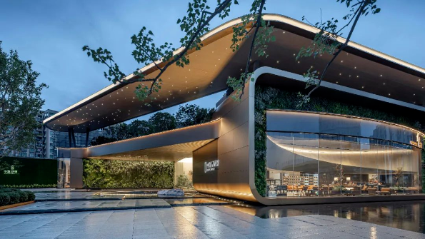 建筑形态上,以足够开放的姿态与周边城市资源充分互动,形成高密度、高能量场的聚散地;建筑风格简洁通透,以灰调格局营造现代时尚韵味,辅以横向线条增加外立面层次感,简洁大气,打造水围地标形象。
