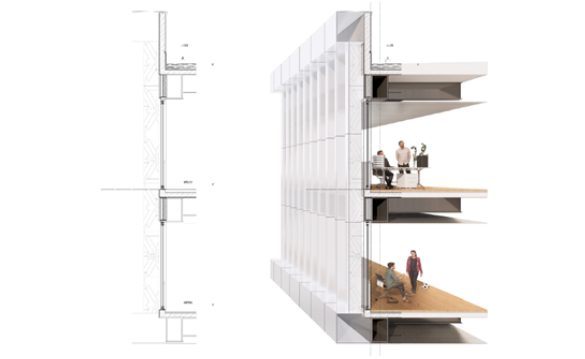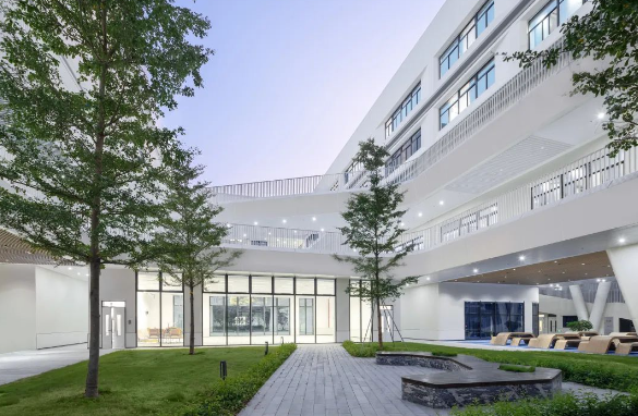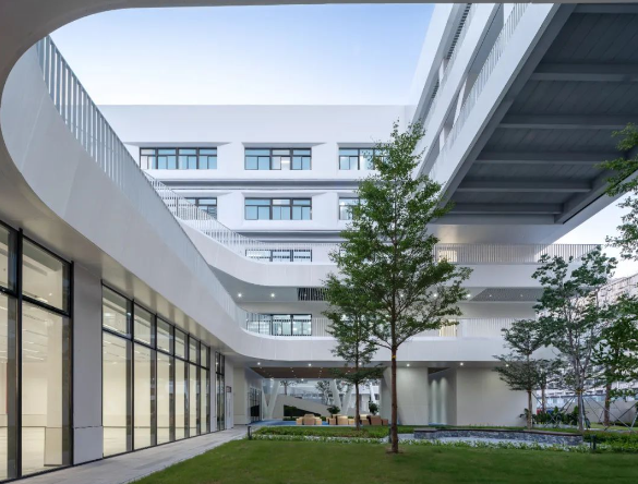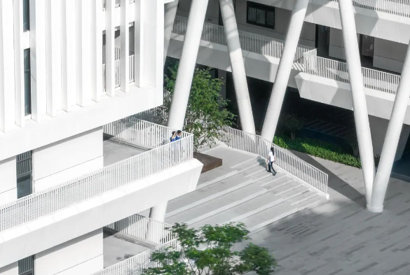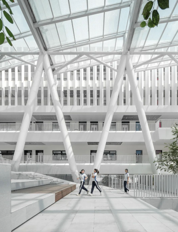 建筑由外廊分支形式的规划结构组成,保证高效的教学模块组合。通过东西向四五层连廊,形成三个围合庭院,庭院内外部空间形成空间感受上的划分,但面向东西向开放通透。