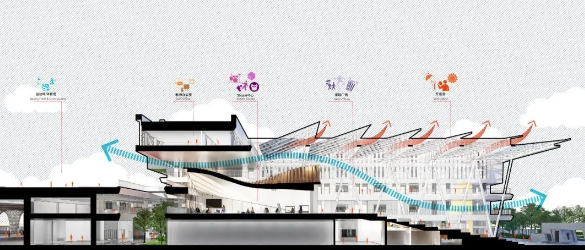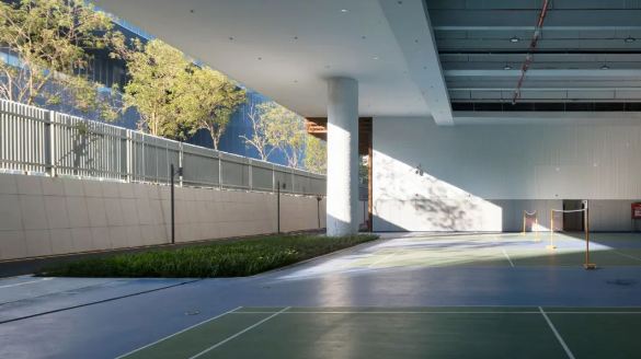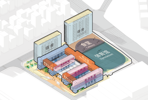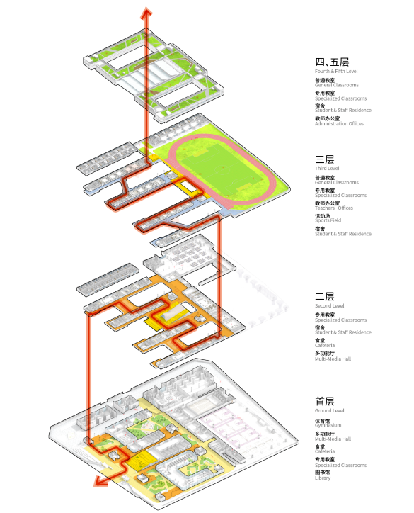 项目毗邻城市主干道新区大道,将大空间功能进行垂直叠加。运动场抬升到十米高度,沿新区大道布置,操场下方是学生食堂,以及架空层、篮球场、羽毛球场的运动区,在屏蔽噪音的同时,解决高容积率校园中大空间功能的布置,塑造积极的城市界面。