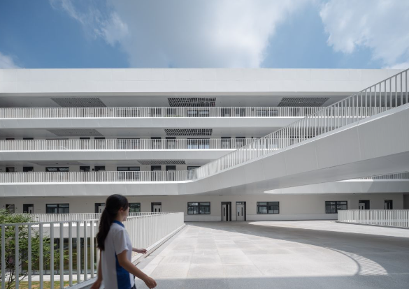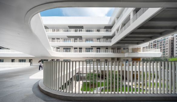项目所处片区正面临城市更新迭代。基地西侧与南侧,分布高密度的城中村,整体色调灰旧。红山中学选择白色的主色调,干净纯粹,给周边的城市氛围带来一抹亮色。
