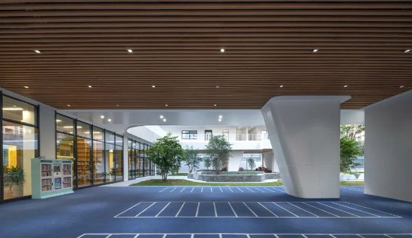 在“中”层级的公共空间,即教学楼之间的连廊、架空层、共享大厅,跨度将近二十米的连廊,结构上实现无柱,空间更加开放通透。首层架空的景观庭院,微地形的处理,丰富的休憩细节,既是讨论学习的自然场所,也是运动切磋的赛场。