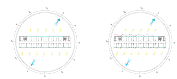 教室采用双廊设计,利用两侧的走廊自然形成遮阳。教学区立面采用大片的格栅,满足采光的同时,不至于让阳光猛烈进入教室。共享大厅雨篷屋顶的彩釉玻璃,可以阻挡一定的阳光和紫外线。宿舍区外立面阳台的外凸铝板,遮阳的同时呈现波浪形韵律感,形成立面节奏。