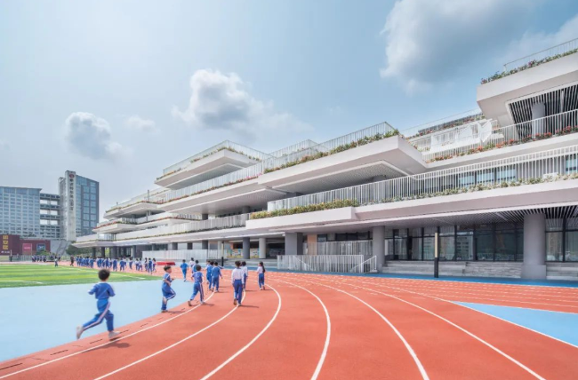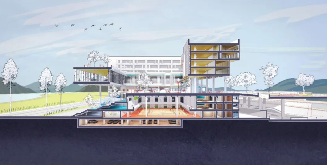 设计将运动场抬升到十米高度,成为教学楼三层的屋顶运动场,串联教学楼的上部的教学空间与下半区的辅助用房。一方面,缩短整体人行流线,在短时间内即可到达运动场地;另一方面,由此形成了教学空间的多层次竖向连接,带来充满趣味、活力的空间体验。