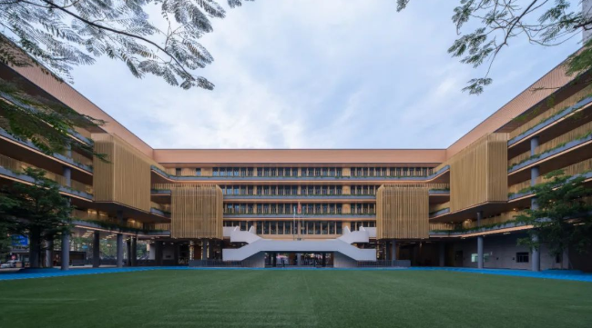 庭院四周,结合“鲁班锁”概念,以现代手法演绎中国传统文化,同时各层的挑空设计也丰富了走廊空间。整个运动场如同立体的超级“剧院”,可容纳大型集会、表演、展览等活动,学生们在此获得超越运动之外的学习生活体验。