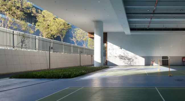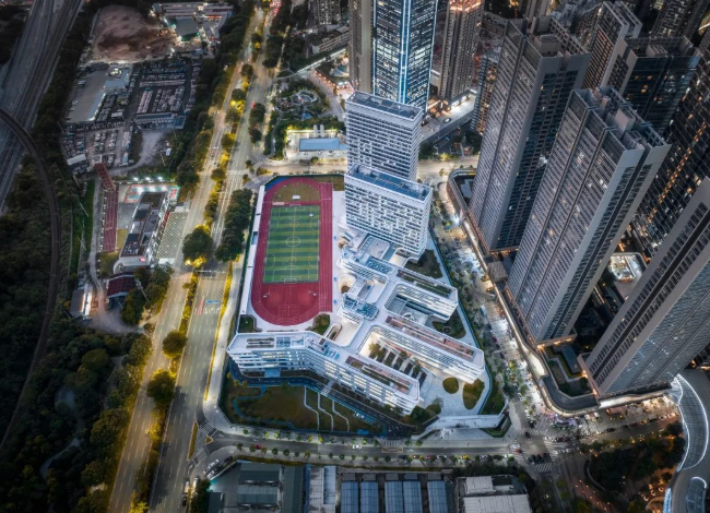 项目地处深圳松岗车辆段,由于场地限制,运动场只能布置于10米高的地铁盖上。设计通过“双首层“策略,利用第一层级的基座化解场地高差,形成两级地面,释放地面活动空间。此外,设计师选择将两个大体育馆置于教学楼底部,利用架空层连接车辆段上方地面,即使在逼仄场地,依然保有充足的、可亲近的运动空间。学生无需经过复杂的流线抵达运动场地,在日常行进中,便可轻松抵达。