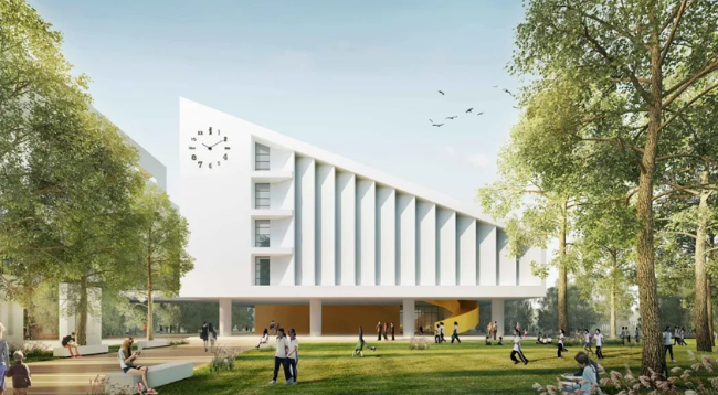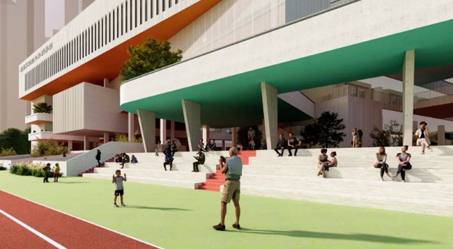 校园小学地块,200m运动场创新性地放置于教学楼中间。设计从古老剧院中获得灵感,将结合室外楼梯设计的讲台和升旗台打造为庭院视觉核心,形成有向心性和仪式感的综合活动空间。