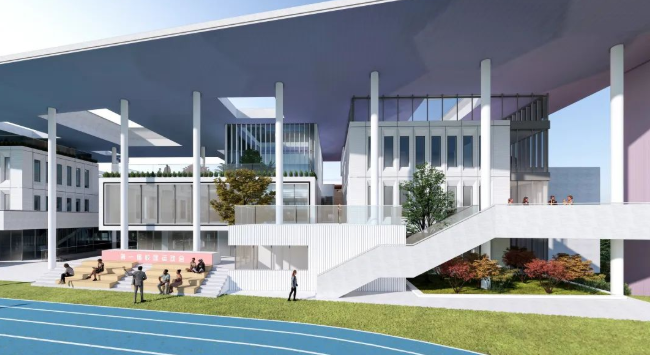 项目将教学楼底部架空,在下方创造了一个可供轻盈运动的校园环境,把大地还给孩子奔跑,自由运动的氛围贯穿全校。教学楼底部的架空空间和运动场彼此连通呼应,完整融合校园的运动系统,使校园无一处不可运动,以建筑的语言构建了积极向上、蓬勃阳光的空间氛围。