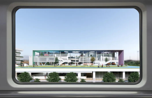 运动场布置于场地西侧,毗邻地铁高架,整个运动场的视野与空间感知都面向更大的城市尺度,并成为地铁窗景的一部分。设计以内向的设计逻辑,着重打造运动场界面。临近运动场的建筑,用错落的退台、盒型空间形成立体看台,在运动场与建筑空间的互动中,衍生出人、建筑环境三者多元的互动关系。从地铁看出去,便是活泼、欢快的青春运动画面。