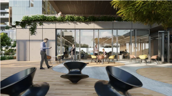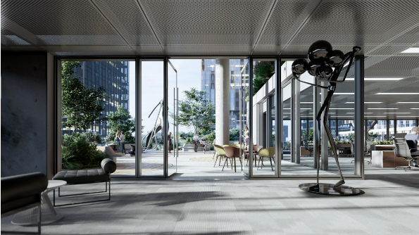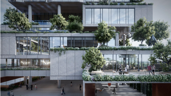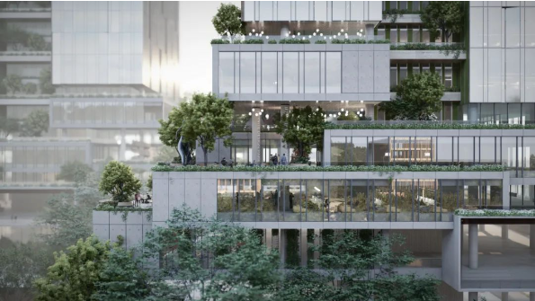在近地面尺度,设计以灵动丰富的空间设计,融合自然场景,让人乐于停留与休憩。室外、裙楼、塔楼空间每一层都有绿色空间并且彼此串联,整体形成垂直、连续的绿色建筑。