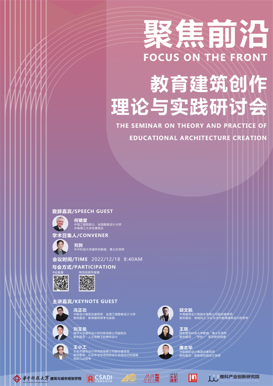12月18日,由华中科技大学建筑与城市规划学院、中南建筑设计院有限公司主办,新建筑杂志社、华中建筑杂志社、维科产业创新研究院协办的“聚焦前沿:教育建筑创作理论与实践研讨会”于线上举行。会议通过分享当代教育建筑创作经验和研究思考,明晰当前教育建筑创作面临的机遇和挑战,展望教育建筑发展的趋势和热点,为进一步推动教育建筑的建设作出贡献。