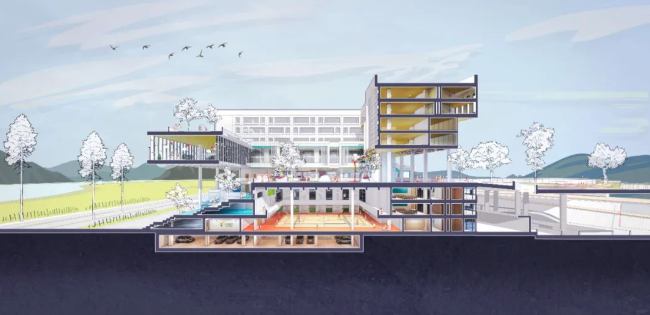 面对局促用地,设计运用了垂直延伸的策略,包括首层架空,退台设计、地下空间开发等,希望能达到空间多样化和土地效益最大化,为学生的成长留下充足的空间。