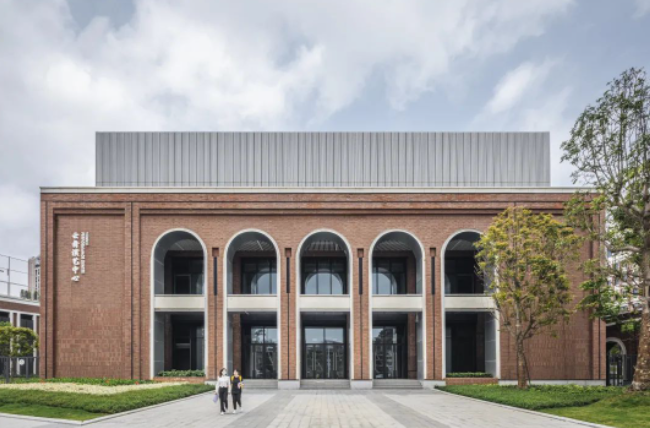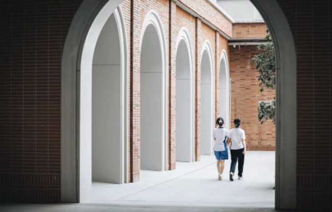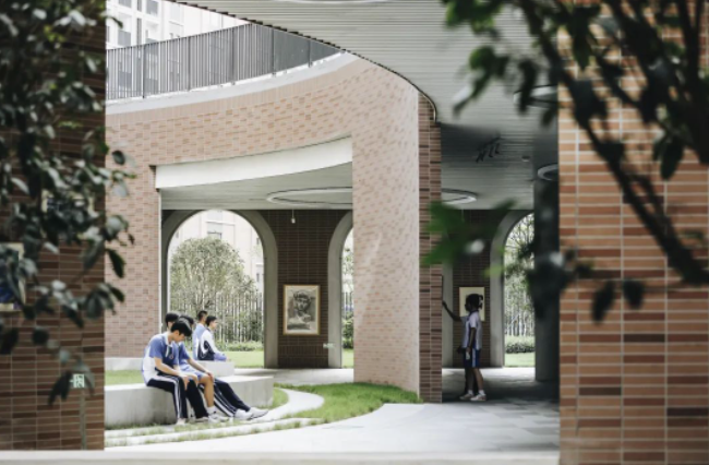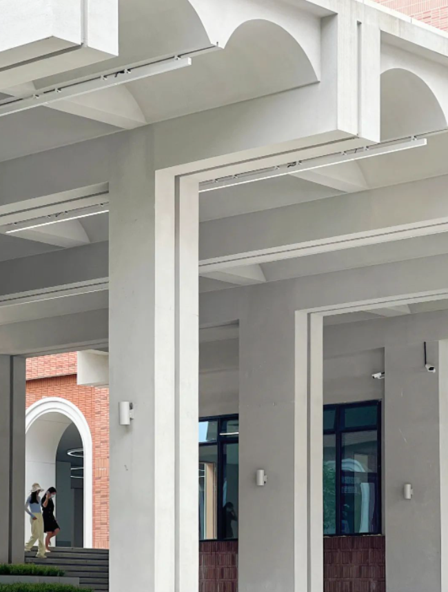 创新高中,强调涵养创新精神,入口采用拱形柱廊的形态,保留古典质感的同时,形成可穿梭、探索的活动空间。光与影随时间创造不同的景色,鼓励同学们探索和发现。