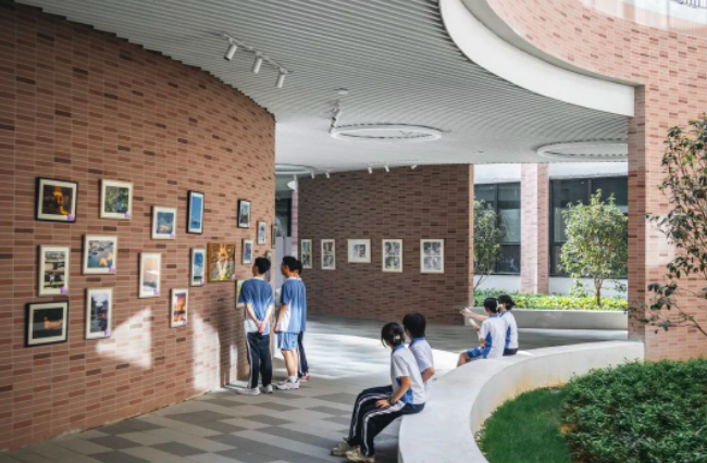 校内首层由两个弧形墙面组成蜿蜒的艺术长廊,作为同学们绘画、作品的展示地