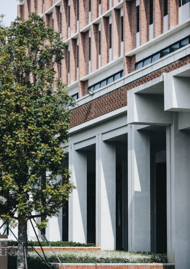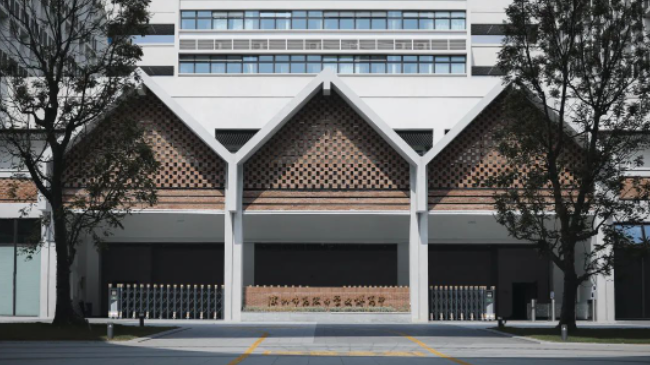 文博高中,以人文彰显为特色,入口规律镂空砖石组成的三个三角形干净、对称,将深圳丰富的自然光线,含蓄而有限地引入校园,浸透古典人文精神中的哲思。