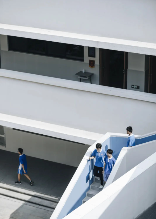 教学楼内白色阶梯串联全楼层,保持简约性的同时,内部刷上轻盈的水蓝色