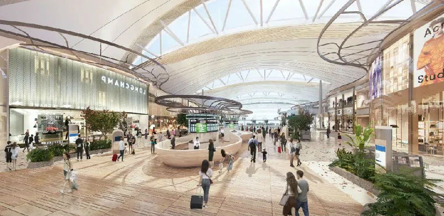 在设计整体中重视机场的标识系统,视觉对空间的辨认和交互系统,比物理空间中的标识给人更深刻的印象。因此项目改造跳脱出做TOD项目的思维框架,去机场化、去交通化,着重打造专属辨识度,将一系列城市元素结合到改造过程。同时结合空中花园、购物空间等,让机场不仅仅是交通空间,更是一个绿洲,一个全方位的新地标。