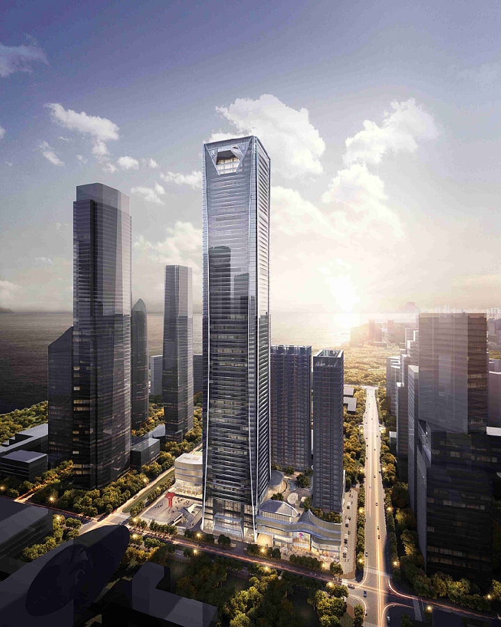 SIC超级总部中心塔楼,深超总基地内业态复合度最高的综合体项目,多种业态垂直叠加。基于对气候、日照与景观的分析,我们在350米的高度做了一个空中观景平台,把建筑屋面空间打造为停机坪,希望成为一处集独特性、体验性、公共性、场景性和艺术性于一体的城市云端休闲目的地。