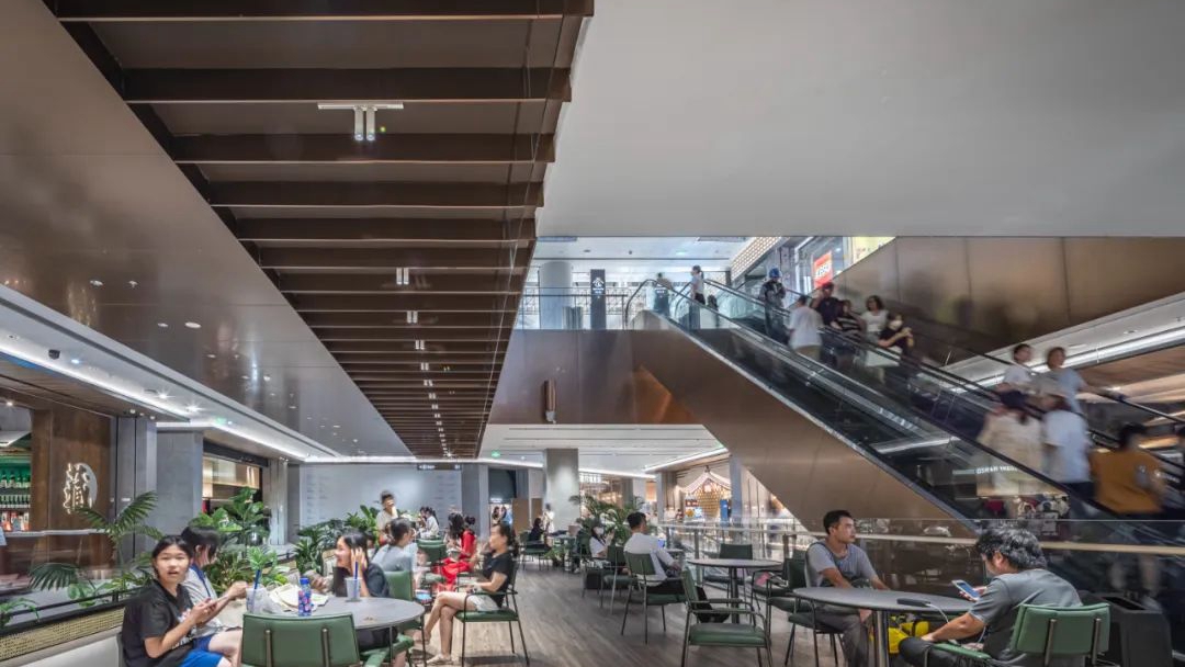 万象食家(商业部分),采用“边厅+中岛”的模式,去传统主力店模式,布置大量公共空间、敞开式品牌店铺。同时规划