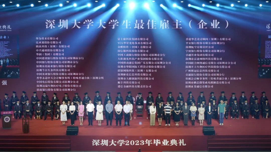 7月2日,深圳大学2023年毕业典礼,也是深圳大学建校40年最盛大的毕业典礼,评选出“深圳大学大学生最佳雇主(企业)”,获评企业涵盖各行各业40家,包括华为、腾讯、大疆等,华阳国际同获殊荣。