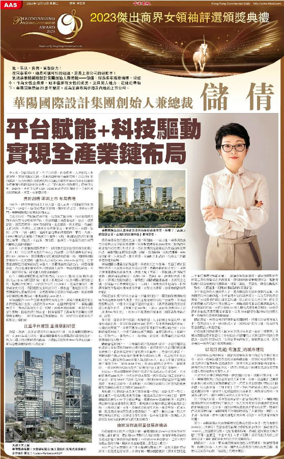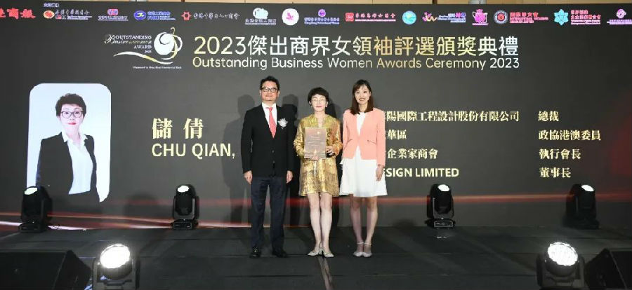 12月12日,由《香港商报》主办的“2023杰出商界女领袖评选颁奖典礼”在香港会议展览中心举行,华阳国际设计集团创始人、总裁储倩获得“2023杰出商界女领袖”殊荣。