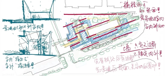 在体量之间创造入口礼仪院,水院及内院空间,串联建筑体块,别有洞天。在空间洄游中,强调步移景异模糊边界,和园林景观互融共生,面对天镜湖打造极致的观景体验。