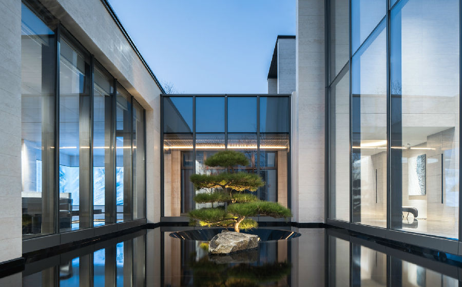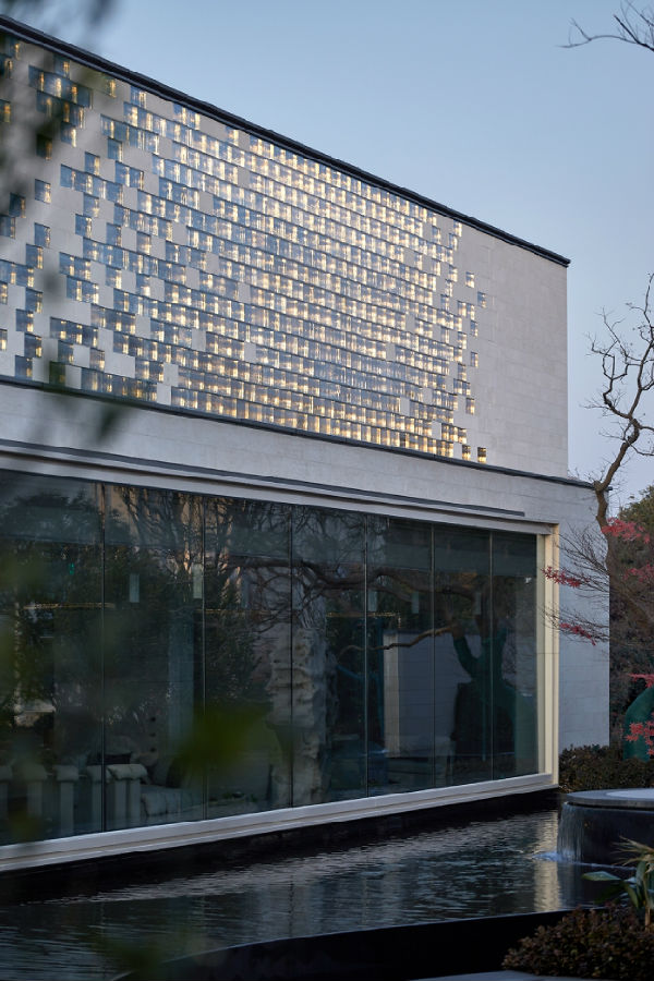空间遍布水景,模糊室内外的界限,嵌套琉璃盒子,打造江南园林的“空间转合”。