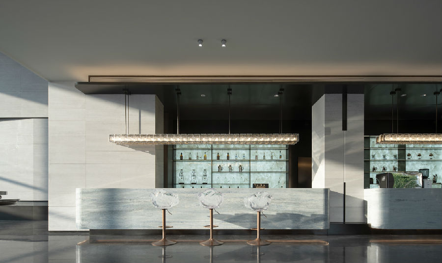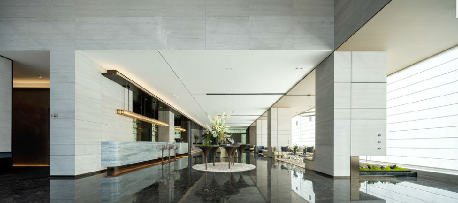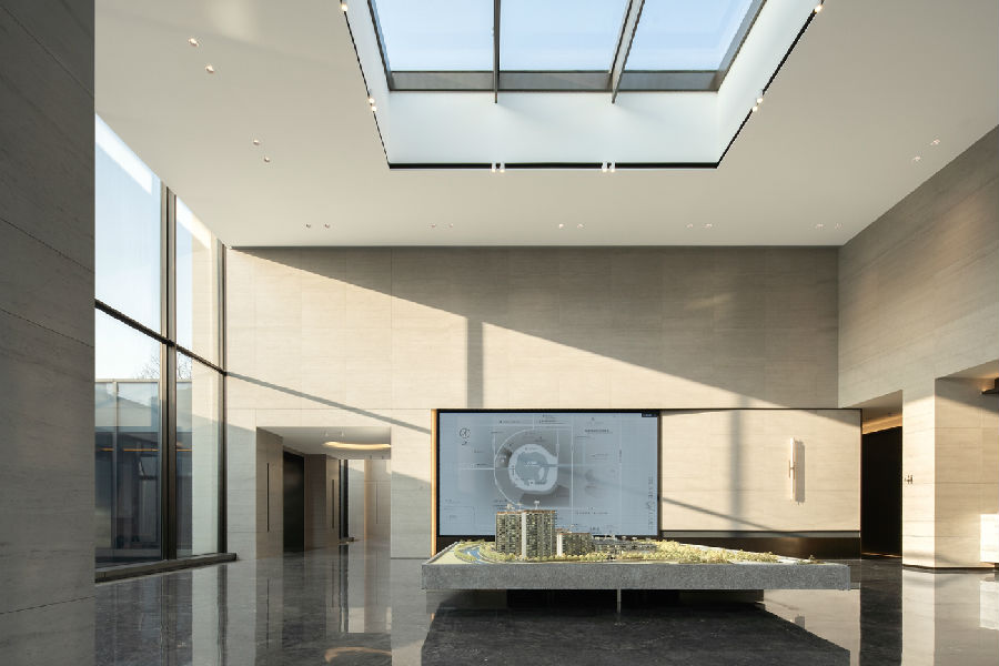 材料选择上着重于现代东方与未来感的营造,为确保落地效果,项目团队多次对应用于现场石材,玻璃砖等材料实地选型,多次打磨推敲材料的上墙效果。同时施工期间也多次巡场反馈意见,通过精心的设计排布,奠定了建筑挺拔舒展而富科技感的形象。
