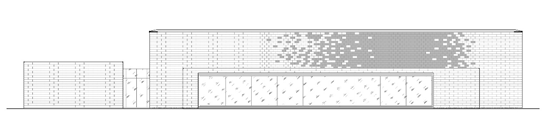 南侧的主要展示面以天镜湖粼粼波光为灵感,将湖光镌刻在舒展的画布上。我们从水纹渐进过渡提取灵感,通过参数化设计的手法,经过多轮的推敲打磨,得到了涟漪状逐级渗透的玻璃砖与石材渐变纹理。