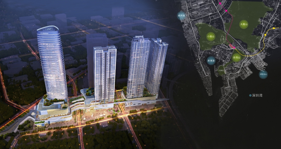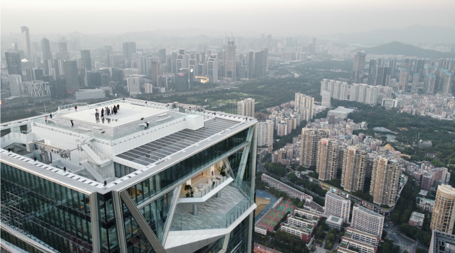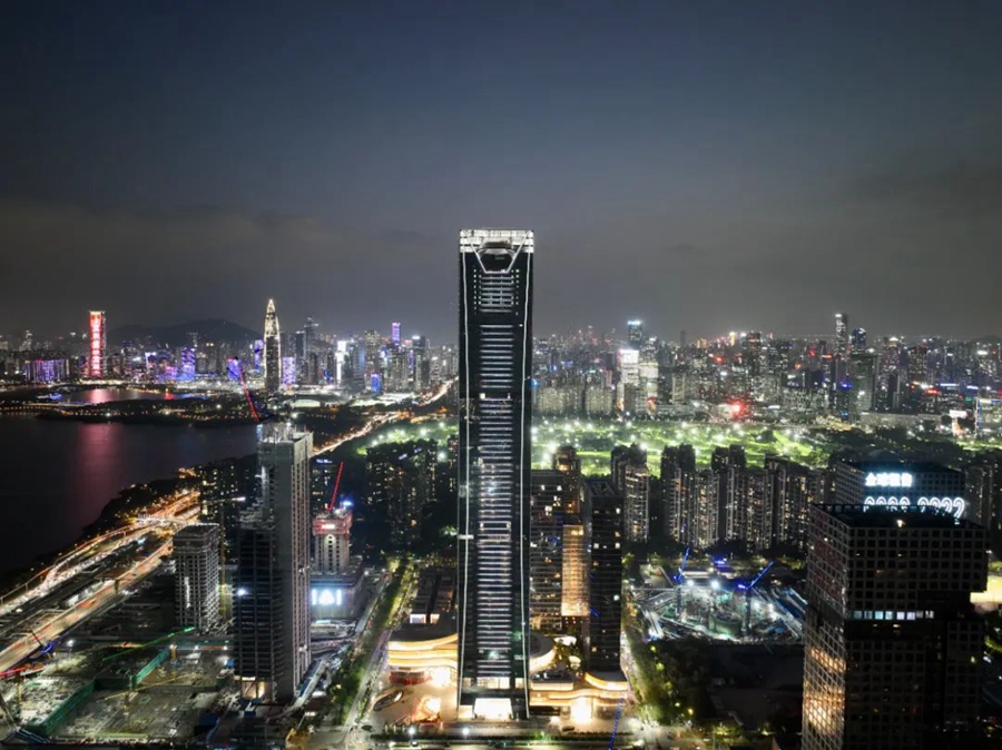 SIC深湾睿云中心塔楼,在深圳超级总部基地,近360米高度打造“湾心之眼”云际观景平台,容纳不同公众活动,俯瞰城市空间场景,成为具有城市记忆的云端目的地;同时开放屋顶观景平台,以镜面玻璃打造“天空之镜”,实现人、城市与自然的互动。