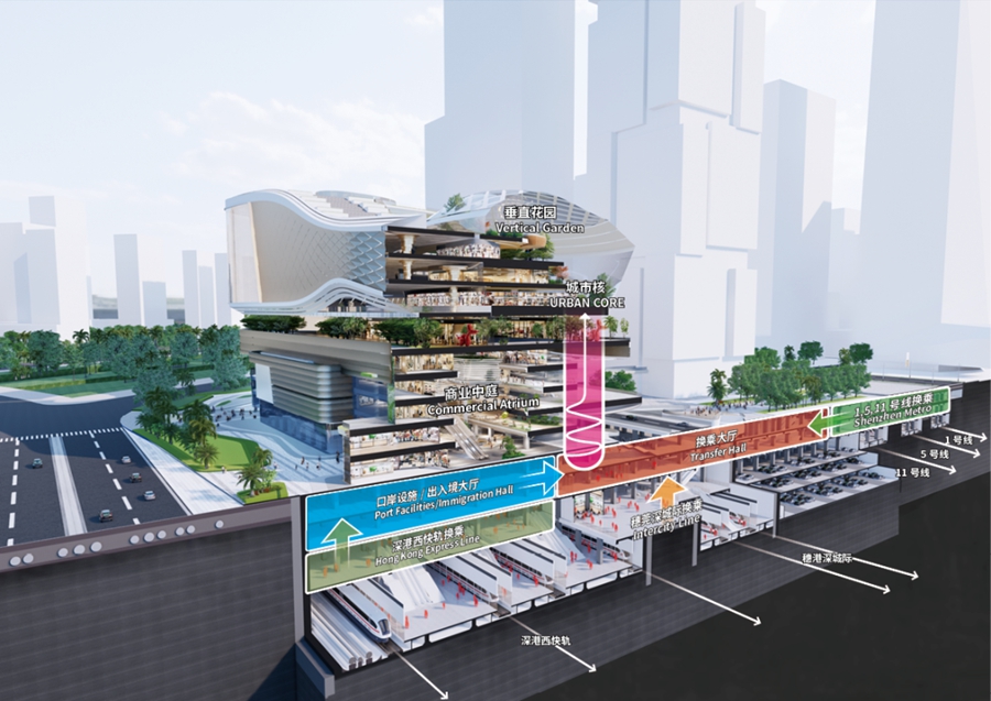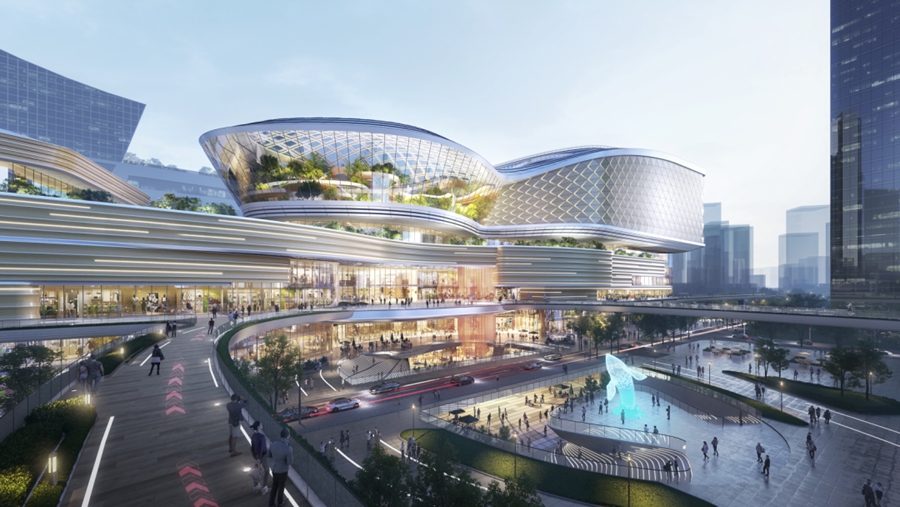 深圳前海赤湾汇广场,一条24小时开放的市民公共通廊缝合赤湾山与小南山,串联山上与地面人流,形成便捷的城市漫游通道;商业设计回应山海交融的场地特色,以丰富的绿植和水景营造内部场景,为行人提供轻松、多元的体验。