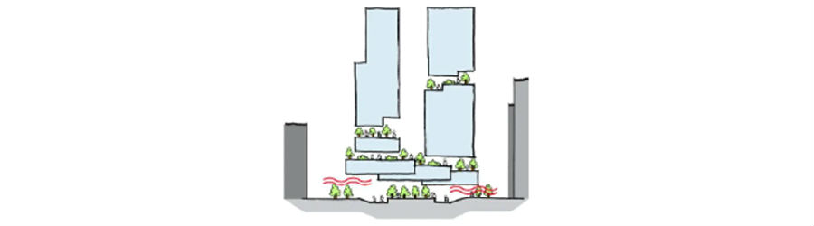 在空间设计上,通过地景引入、立体绿化、空中庭院、下沉广场方式将自然元素融入建筑之中,在高密度办公楼中营造舒适、人性化的研发办公微环境。