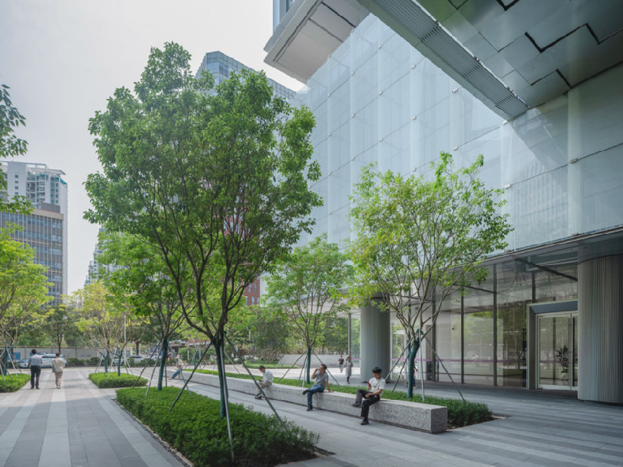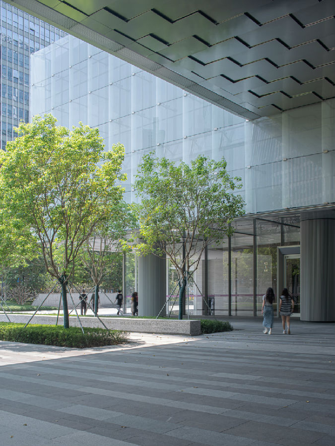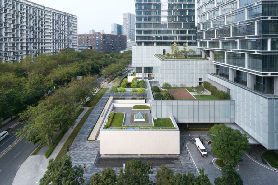 同时,设计选择将底层架空,消解城市界面连续性与实体拥堵感。裙房体块“漂浮”,形成有遮盖、有阴凉、尺度宜人的开放空间,人们可以从不同方向进入场地内停留、参观、休憩、工作......底层架空和开放式的景观设计,创造出开敞、通透、自由的公共空间。