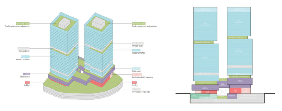 在建筑高区,除科研、实验空间外,设置通高中庭,提供交流和休闲的场所,拉近人与人之间的联系,提高信息传递的效率。