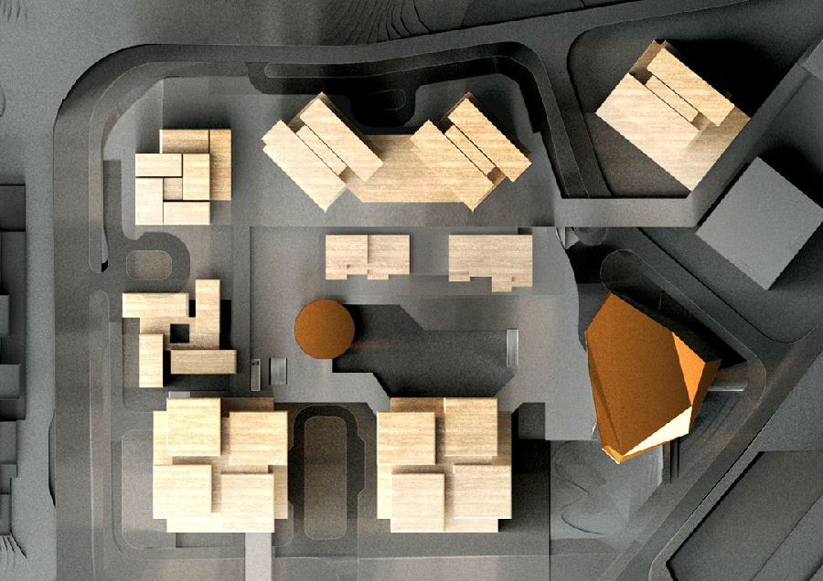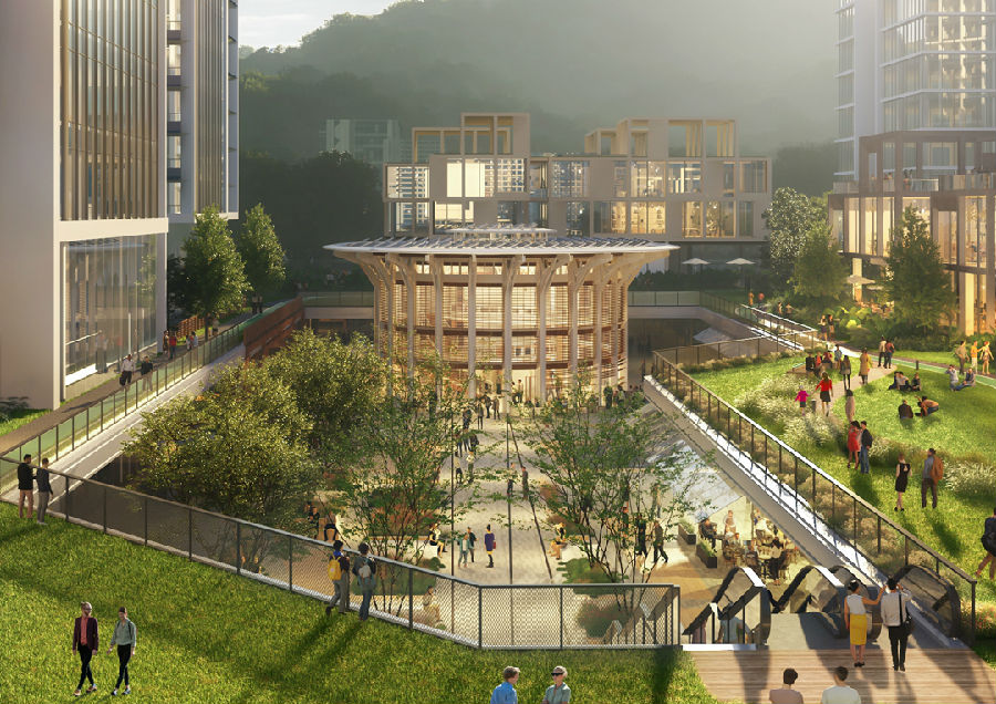 在入口中轴与商业街中轴交汇处,是一座纯木结构的山下围屋,以24组围屋结构达到真正的负碳建筑。除核心筒部分以外,所有建筑材料应用木材,全木主体建筑与低碳材料的自然融合,成为园区的木之原点。围屋与公共空间主轴“绿毯”形成林荫合院,打造24小时慢行商业街区。