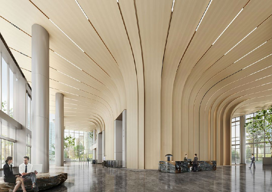 主塔楼,以榫卯为设计意象,延展为“叠塔”设计,主塔与副塔相互呼应,形象简洁有力。大堂室内设计采用“树抱石”理念,核心筒为石,吊顶为树冠,向四周发散,做到建筑、室内、景观一体化。