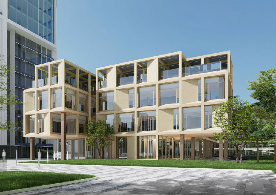 在方案设计中,唐志华先生以深厚的文化底蕴,提出“木石之盟”的设计概念,在中国传统文化中,木是生活,石是精神,两者互相影响协同共生。整体方案基于中国内在精神的审美逻辑和形象特征,利用榫卯、风车楼、鲁班锁、树抱石等设计语言,打造具备美学特色与近零碳建筑设计技术的未来建筑。