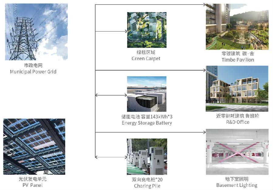 全国首个光储直柔园区级示范应用:打破技术壁垒,利用光伏发电、双向充电桩、储能电池柜等,有效提升配电效率,挖掘可再生能源应用,打造新型供电示范场景。在独特的“光储直柔”系统设计能力下,光伏可再生资源发电量占项目年消耗电量比例的10%以上。