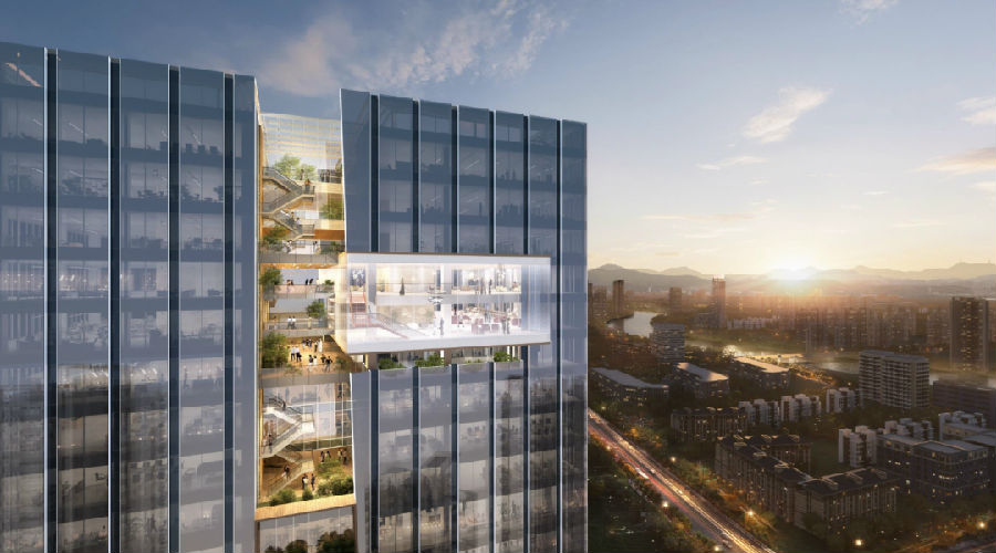 01 摩天工厂-深圳宝龙上井产业园,深圳市首批“工业上楼”试点项目。规划上,形成“南产北城,生态在中央”的发展格局;层层退台,将周边景观引入园区,打造“中央城市绿谷”,建成24小时公共漫游平台。高密度空间组合中,兼顾高效流线与丰富的公共空间。