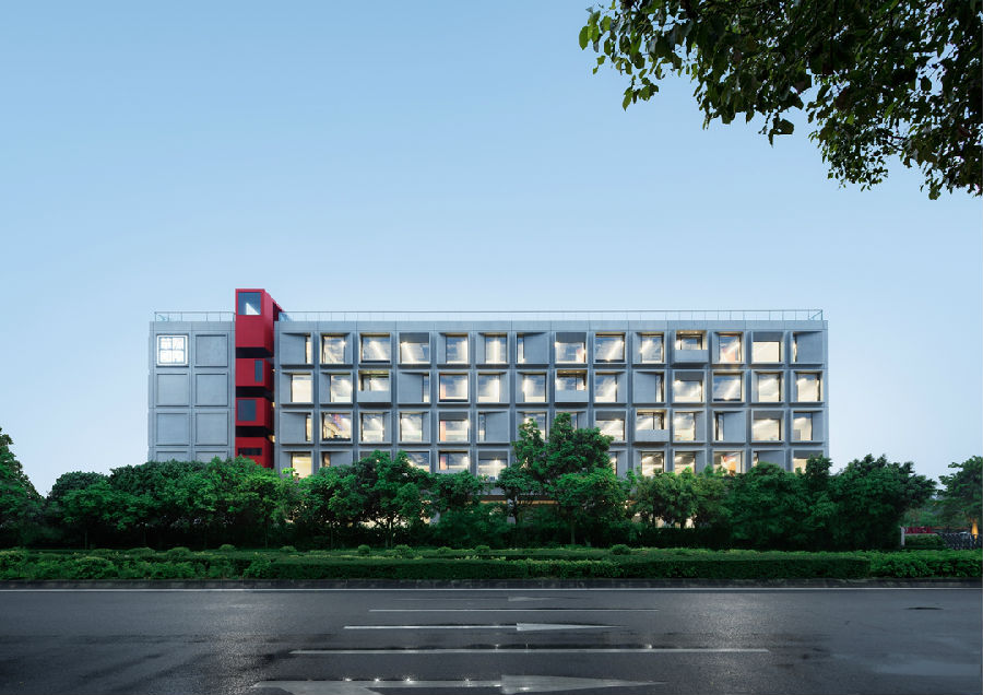 ▲ 立面设计构思灵感来自“活字印刷术”。通过5个标准化窗洞单元组件的巧妙排列组合,形成了极具特色的产业化办公建筑立面肌理。