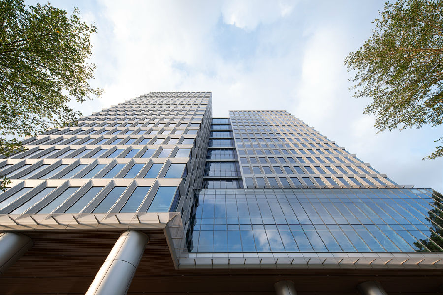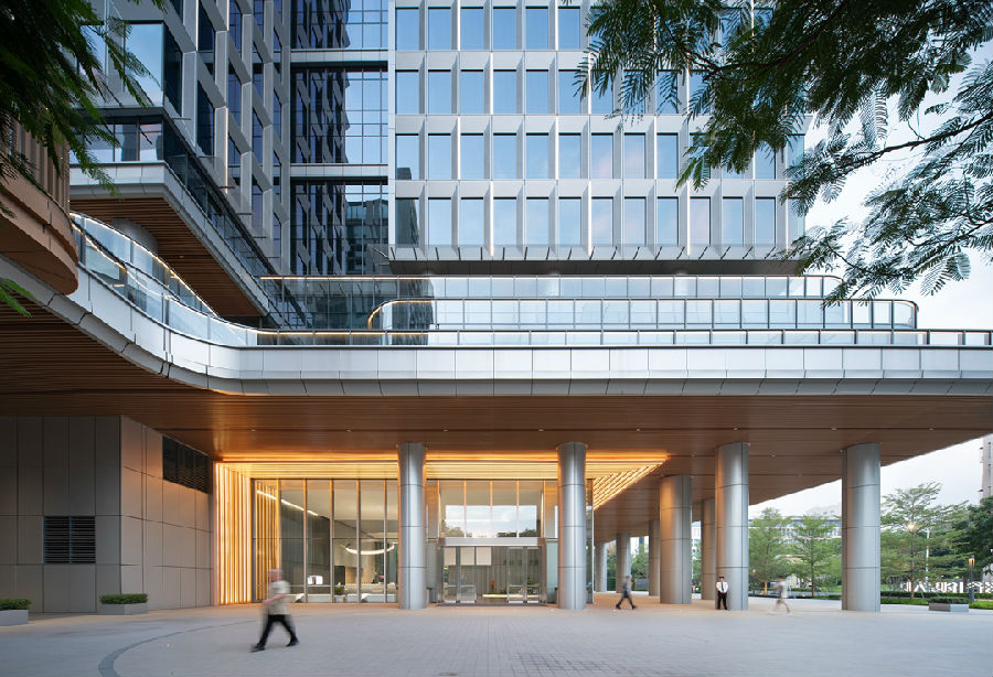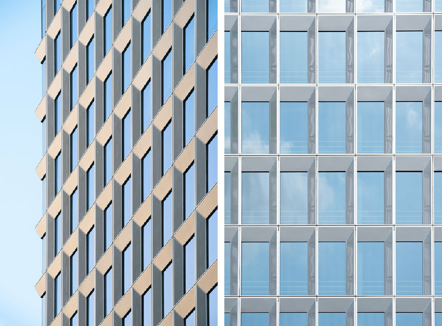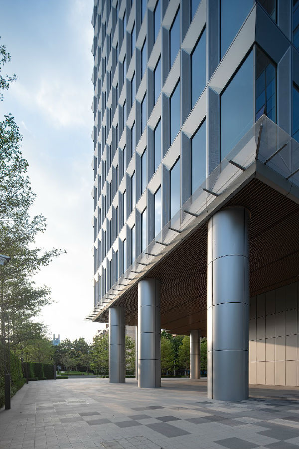 醒目的格构幕墙设计赋予塔楼精致的韵律。为力求建筑完整性,立面采用隐藏式开启扇;同时近人高度的内平开窗也为办公环境提供更有效的通风效果,使整个项目更加节能环保。