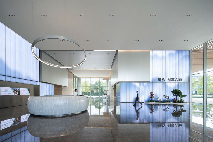 区别于传统办公空间的大堂设计,我们将绿意纳入室内,全通透的洄游式办公大堂设计给人回归自然的愉悦感和松弛感。