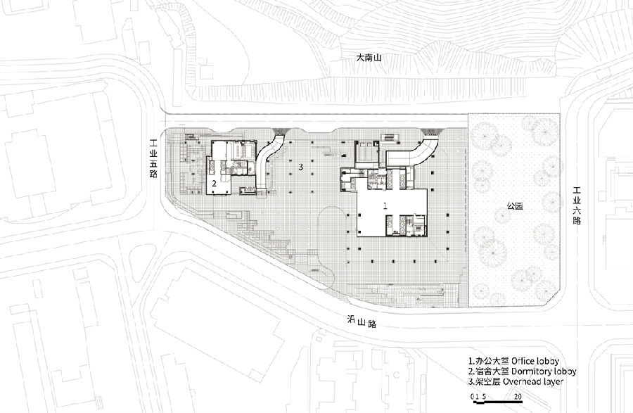 秩序产城之上,打造绿色云台。设计通过架空裙房连接城市和山体公园,引山入城,形成良好的空间格局,打造山、城、人一体的多样化产业街区。