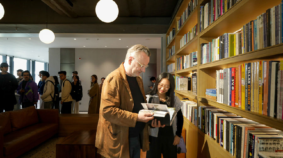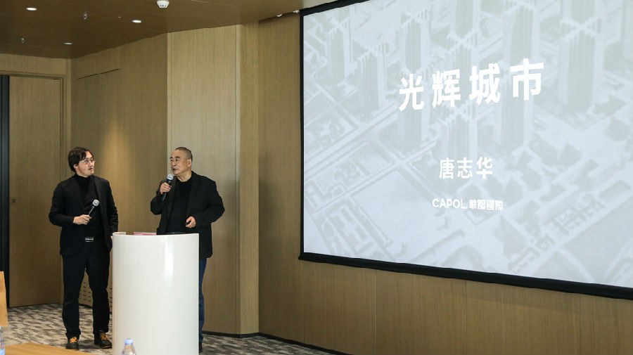 △深圳大学建规学院副院长齐奕(左)带队考察,华阳国际设计集团总建筑师唐志华(右)分享《光辉城市》