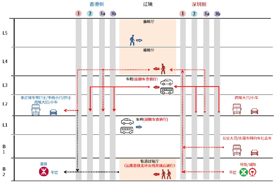 新皇岗口岸将监管深圳50%的进出境车辆,设计以“快速到达,内部贯通“的区域交通策略,通过交通需求预测分析与各口岸通关数据分析,结合口岸垂直叠加的特殊性,科学制定不同类型车位数量,并采用深港“合作查验、一次放行”创新合作查验模式,并预留后期更为便捷通关的查验模式可能性,提高口岸通关的便利性。设计通关路径,预计可承载高峰日通关量30万人次。