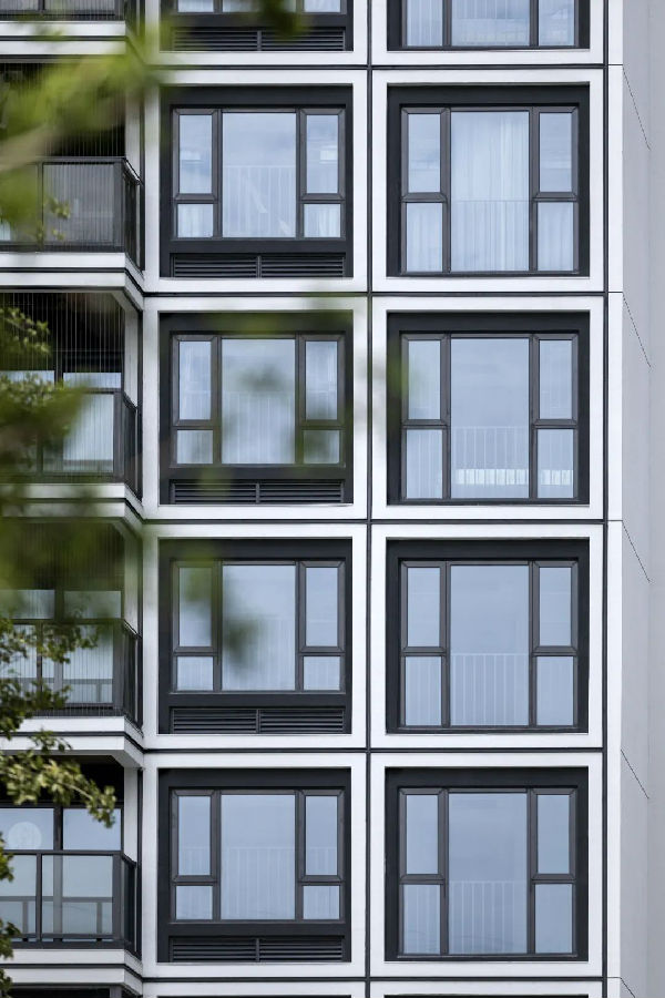 立面延续艺术片区白色风格的基调,工业化设计语言通过格构元素得到强调,形成既节奏理性又充满律动的立面表情,在自然的光影变幻下,雕刻装配式建筑的简约之美。